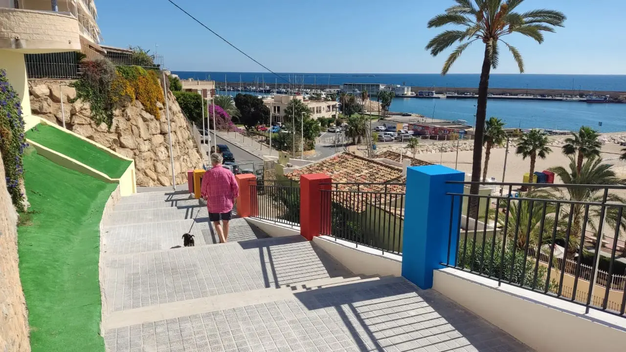 Sobre el terreno, se ha reconstruido la bajada de amplias escaleras a la que acompaña una nueva barandilla que otorga mayor seguridad al recién inaugurado vial de acceso a la Basseta de l’Oli de la playa Centro.