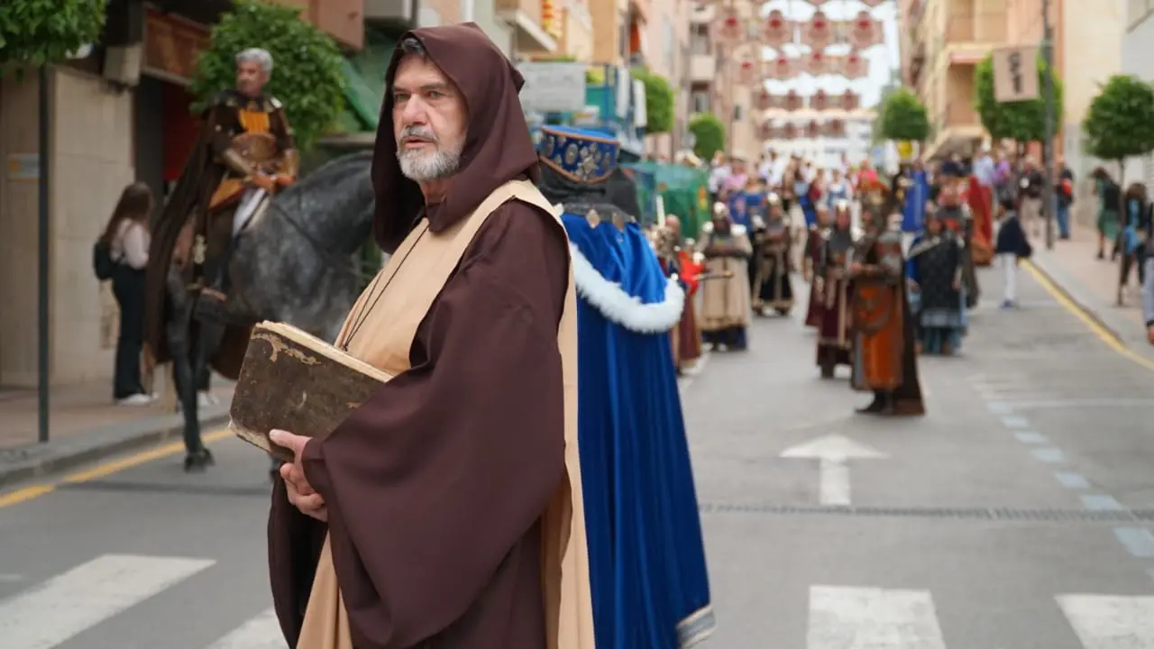 El almirante del rey Jaime II, Bernat de Sarrià, encarnado este año por Joan Vives Zaragoza, acompañado de su séquito conformado por familia y caballeros, volvieron a desfilar por las calles de la Vila Joiosa entre gran expectación para rememorar su historia, recordando aquel 8 de mayo de 1300 en el que el Bernat de Sarrià fundó una nueva población, a la que bautizo con el nombre de Vila Joiosa.