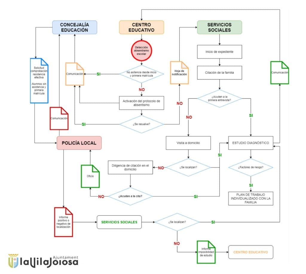 Para ello, el plan establece el protocolo a seguir con las actuaciones coordinadas de cada parte. Los centros educativos iniciarán el protocolo de absentismo notificándolo a la concejalía de Educación.