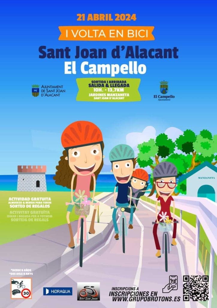 Los interesados ya se pueden inscribir en la web www.grupobrotons.es, y se admitirá participación hasta 30 minutos antes de la salida. Para el próximo 21 de abril, domingo, las concejalías de Medio Ambiente de los ayuntamientos de Sant Joan y El Campello han organizado la “I Volta en bici” entre ambos municipios, una prueba abierta a la participación de toda la familia que contará con avituallamiento, seguro de participante, servicios sanitarios y regalos.