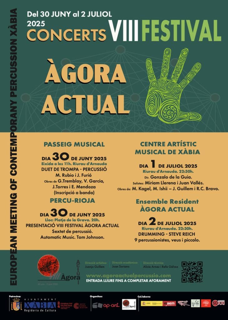 Xàbia volverá a convertirse en referente de la música contemporánea con la celebración del VIII Festival Àgora Actual, que tendrá lugar del lunes 30 de junio al miércoles 2 de julio. Un evento que, año tras año, consolida a la localidad como el epicentro de la percusión actual en la Comunidad Valenciana.